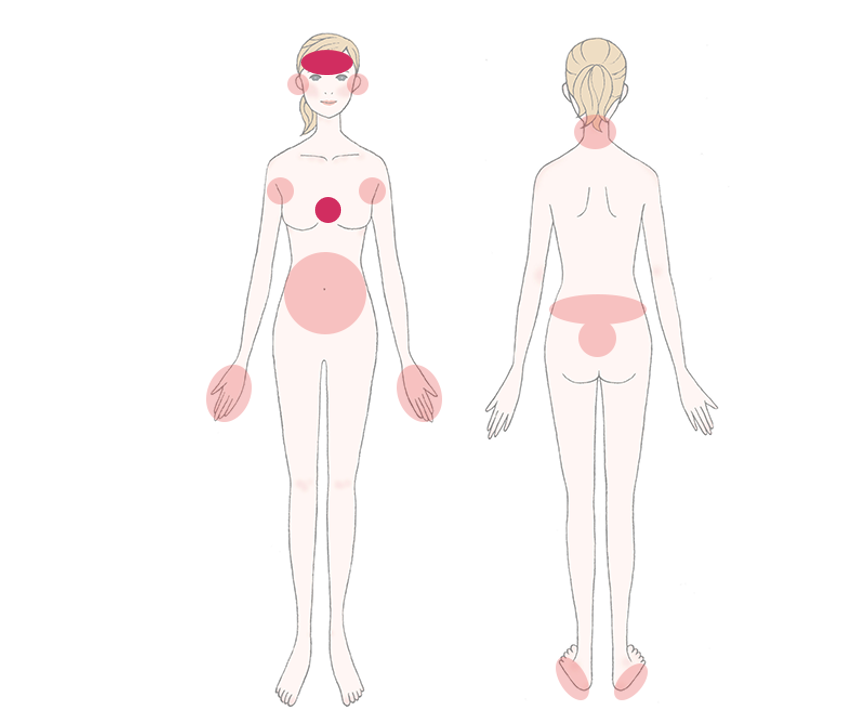 リラックスするポイントは、額、耳、首の後ろ、手の平、手指の爪の際、腕の内側、お腹、胸の中央、仙骨、足の裏、脇などです。