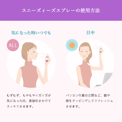 目鼻喉頭など、スッキリさせたいところに吹きかけてすり込みます。